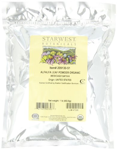 One pound of certified organic alfalfa leaf powder packaged in a polyfoil resealable bag.