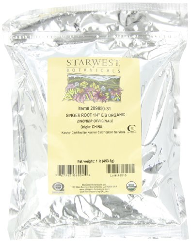 One pound of certified organic ginger root cut packaged in a polyfoil resealable bag.