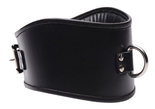 This collar is made with thick leather padding that feels comfortable and secure around the neck without being too constrictive. It locks in place with a buckle that could have a lock attached. There's also a half ring in the front, so you can attach a leash and lead your sub around the room or even down the hallway and around the block. Measurements: This collar fits necks from 12 to 18 inches.