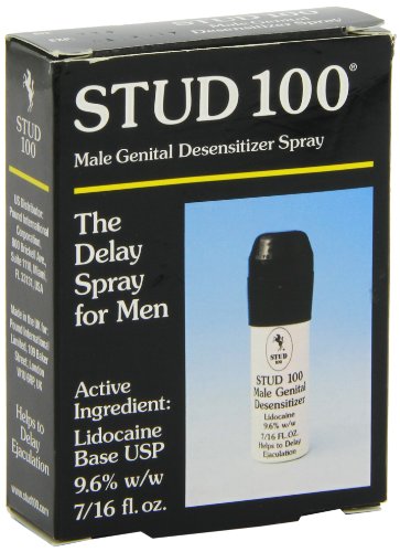 STUD 100 Desensitizing Spray for Men works at once and is easy to apply. Clinical Trials have proven that STUD 100 is quick-acting, safe and effective. It is self-administered. It comes in a discreet 3" high (75mm) can fitted with a metered pump spray. It contains 7.16 fl oz (12g) - around 120 sprays - and is supplied together with a multi-language instruction leaflet. STUD 100 is non-toxic, odorless and ozone friendly. Stud 100 has an active ingredient in it called Lidocaine , a well-known anasthetic. It delays ejaculation by reducing the sensitivity of the penis. It is a licensed pharmaceutical in the UK and meets all US FDA requirements. It is the only spray formula with lidocaine licensed for use without a prescription by health authorities around the world, and is available online without a prescription or consultation. Stud 100 is quick-acting, safe and effective and, what's more, you don't need a prescription to buy it. The discreet 3 inch pump-action spray (with child-resistant cap) will easily slip into your pocket or purse.Stud 100 has been helping millions of couples achieve better, longer-lasting sex for over 30 years. Generations of lovers can't be wrong! The active ingredient, Lidocaine, is a local anaesthetic which is used to reduce the sensitivity to touch of the penis just before intercourse. The reduction in sensitivity quickly helps to delay ejaculation in cases of over-rapid or premature ejaculation.
