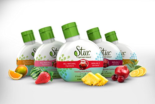 - DELICIOUS FLAVORS ----- This Stur Variety 5-Pack contains 5 bottles - including Fruit Punch, Strawberry Watermelon, Pomegranate Cranberry, Orange Mango, and Black Tea + Lemon! It just tastes natural, not chemical or processed. Add Stur to your tap water, bottled water, Sodastream/ sparkling water, even cocktails. This 5-Pack MAKES 100 8OZ. DRINKS for a fraction of the price you'd pay for bottled drinks (such as vitamin-infused waters). This is a special offer, not available in grocery stores. Stur was made by a husband for his wife and twins - and our brand is about doing something good for your family.
