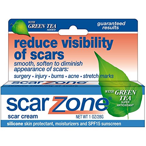 Guaranteed results. Reduce visibility of scars. Smooth, soften to diminish appearance of scars: surgery; injury; burns; acne; stretch marks. Silicone skin protectant, moisturizers and SPF15 sunscreen. With green tea super antioxidant helps restore damaged skin. SPF15 helps protect from sun. Formulated with moisturizers and silicone skin protectant. Massaging Scar Zone into the scar begins the process of reducing its appearance by helping it fade, diminish and become less noticeable. When massaged into the scar twice daily, Scar Zone even helps raised and discolored scars become flatter, softer, smoother and closer to the skin's own natural tone. Green Tea's combination of antioxidants and EGCG helps restore damaged skin cells. Scar Zone works on new wounds that have healed or on older scars that are still visible. So no matter how long you've had the scar, Scar Zone should help. It can be worn under makeup and under clothing because it will not stain.