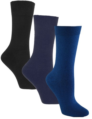 3 pack includes; Black flat knit, Navy Ribbed, Sapphire Ribbed. Our Health & Comfort Sox stretch further than a regular sock with a non-binding top, promoting circulation and keeping you comfortable. Avoiding the sock ring imprints on legs helps toward the prevention of blood clots and varicose veins. Great diabetic sock or for travelers, sensitive feet, circulatory problems, swollen or wide feet and legs. Enjoy the super comfort and style of our Sugar Free Sox and live healthy! Fabric Contents: 80% Cotton, 17% Nylon, 3% Spandex Ladies sock size 9-11 fits shoe sizes 4-10 Crew length- Also looks great folded over into an anklet!