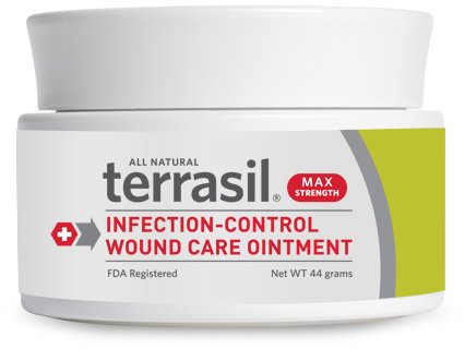 Terrasil Wound Care Max antiseptic ointment contains double the concentration of bacteria-fighting ingredients and skin protectant (than regular strength Terrasil Wound Care Antiseptic Ointment) to form a strong barrier against infection, for rapid healing of wounds. Terrasil Wound Care Antiseptic Ointment Max is a unique all-in-one wound treatment system in a jar. This powerful new FDA-registered formula combines the latest science with the finest organic and natural ingredients for superior results. Terrasil Wound Care is the only wound treatment available that features patented Activated Minerals, a proprietary blend including Volcanic Clay (Bentonite), Magnesium Oxide and Zinc Oxide. These nutrient rich minerals support the natural production of new, healthy skin cells, skin repair and reduced scarring. Terrasil's all-natural moisturizers and essential oils provide additional benefits to dry, damaged skin. Terrasil Wound Care Max also contains powerful antiseptic (bacteria-fighting) ingredients that reduce the risk of infection, which is the biggest cause of delayed healing in wounds.