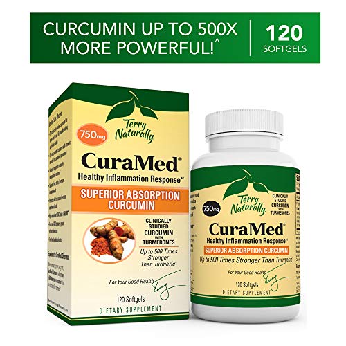 -Terry Naturally CuraMed the only patented curcumin with turmeric essential oil containing turmerones -Superior support for a healthy occasional inflammation due to exercise or overuse response -Supports liver, brain, heart, and immune health. Protects cells from oxidative stress and free radicals -From non-GMO turmeric grown without chemicals, provides 500 mg of full spectrum curcuminoids per softgel, High antioxidant ORAC value >1,500,000 -No: sugar, salt, yeast, wheat, gluten, corn, soy, dairy products, artificial coloring, artificial flavoring, or artificial preservatives. NON-GMO Color variations are normal.