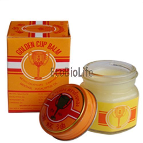 Golden Cup Balm is a world famous tropical pain relieving ointment. A versatile external medication, Golden Cup Balm provides effective relief for most symptoms of bodily, aches and pains including headaches, rheumatism, arthritic pains, and muscle strains and sprains. Golden Cup Balm with its unique formulation of herbal ingredients, derived from ancient Chinese sources, has been proven effective for nearly one hundred years and today used by millions of people in more than 100 countries. Golden Cup Balm is not an ancient Chinese concoction but a modern efficacious medication that has worked for millions of people. Who use? Golden Cup Balm is used for muscular rheumatism, strains, insect bites, burns and sprain, eczema, nasal decongestion. Unique yellowish balm from Golden Cup composes of methyl salicylate camphor, menthol, eucalyptus oil, and others. It has a characteristic pungent aromatic odor Ingredients : Methyl Salicylate 15%, Menthol 12.0%, Camphor 15.0%, Cajuput Oil 1.0%, Clove Oil 0.5%, Eucalyptus Oil 16.0%, Peppermint Oil 6.3%, Cinnamon Oil 0.5% . 1 box=50g