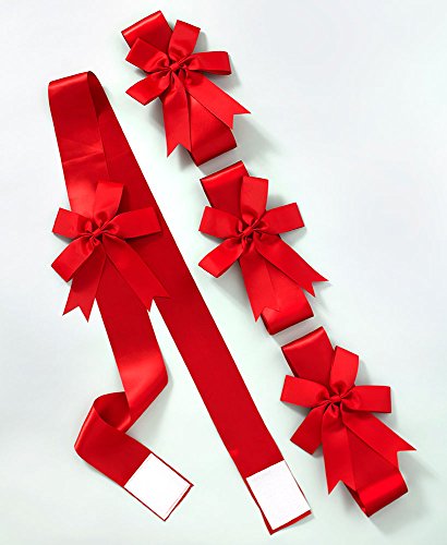 Use the Set of 4 Cabinet Ribbons to spruce up your kitchen for the holidays. Each is easy to wrap around the door and has a fabric-magic closure for adjustability. Fits cabinets from 28-3/4"L to 37-5/8"L. A lovely 9" bow is sewn 52" from the top of the ribbon. 3-1/2"W x 76-3/4"L, laid flat, each. Polyester. Imported. Give your kitchen a classic holiday look  Compatible with different cabinet styles  Details:  3-1/2"W x 76-3/4"L, laid flat, each  Bow, 9", each  Polyester