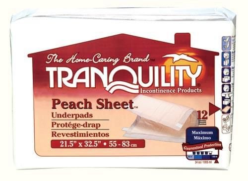 The Tranquility Peach Underpad has a superabsorbent lining and features four adhesive tape tabs to secure positioning to wheelchairs, bedding and furniture. The patented Peach Mat contruction guarantees skin dryness and odor control. Four adhesive tape tabs secure pad to bed, or other furniture. (5 bags of 12)