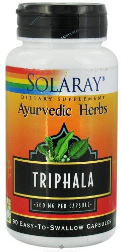 Triphala Extract 500mg (Ayurvedic) by Solaray 90 Capsule Triphala the most widely used herbal blend in Ayurveda was valued by the ancient Hindus as good manager of the hosue . Triphala contains equal parts of three fruits Terminalia chebula Terminalia belerica and Embelica officinalis. The triphala fruit extract in this product is guaranteed to contain 45 tannins. Size 90ct 500mg Directions As a dietary supplement take 3 capsules daily with a meal or glass of water. Serving Size 3 Capsule 30 Servings per container Ingredients Amount per serving Daily Value + Terminalia belerica (fruit extract) 500 mg Emblica officinalis (fruit extract) 500 mg Terminalia chebula (fruit extract) 500 mg Key to Ingredients Daily Value not established. + Percent Daily Value is based on a 2 000 calorie diet. Values differ depending on age Values differ depending on age Other Ingredients Cellulose gelatin (capsule) and magnesium stearate Other See product label for more information.