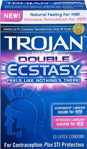 Trojan Double Ecstasy Condoms feature a revolutionary design that lets you feel the pleasure, not the condom. Different lubricants on the inside and outside of the condom help maximize the pleasure for each partner. Tapered at the base for a secure fit. Comfort shape allows freedom of movement for a more natural experience. Intensified lubricant outside warms and excites. Deep ribbing throughout the condom delivers maximum stimulation. Ultra smooth premium lubricant inside for a more natural feel. Made from premium quality latex; to help reduce the risk. Each condom is electronically tested; to help ensure reliability. Always insist on Trojan America's 1 condom trusted for over 90 years.