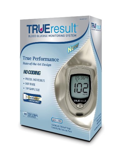 Nipro Diagnostics TRUEresult Glucose Meter Kit, Results in 4 sec, No Coding Accurate, precise results as fast as four seconds Requires only 0.5 microliters, Alternate site testing increases flexibility Memory stores up to 99 test results Glucose control detection Automatic on/off Strip release button eliminates handling of strips after testing For use with TRUEtest strips. Strips are made in USA. Kit contains TRUEresult glucose meter with 3V battery installed, 10 TRUEtest strips, lancing device, 10 sterile lancets, owner's booklet, quick reference guide, self-test logbook, compact carrying case. Four testing reminder alarms - to help you remember to test. Weekday Display - for easy reference of test results by day. 500-Test Memory - Includes time/date and 7-, 14- and 30-day averaging. No coding required. Audible fill detection. Glucose control detection. Ketone test reminder. Alternate site testing. Strip release button. Automatic on/off.