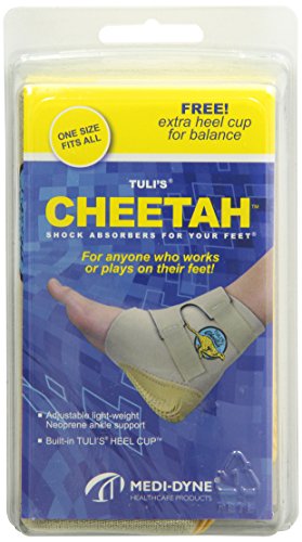 At last, Shock Absorption and Ankle Support in one lightweight unit. Tuli's Cheetahs are a dynamic and revolutionary new combination of Tuli's Heel Cups shock absorption technology and the comfort and stability of a lightweight neoprene ankle support. Tuli's Cheetahs are ideal for athletes, gymnasts, adults, children, or anyone who works or plays on their feet. One size fits all comes with adjustable velcro straps. Additional heel cup included.