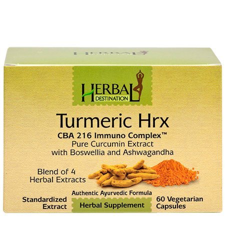 The synergistic benefits of Herbal Destination's Turmeric Hrx (1100 mg) with pure Curcumin, Boswellia and Ashwagandha are exceptional.---------- This ancient, authentic formula meets and or exceeds American Herbal Products Association's (AHPA) standards for heavy metals as well as California standards.---------- Non-GMO: This product is made from ingredients that were not genetically engineered.---------- Each box contains 60 Vegetarian Capsules with a serving size of 2 capsules per day. -----------Turmeric's benefits are well known and talked about by renowned herbalists as a top spice one must include in their daily diet. It is a yellow colored root similar to ginger and has been used as a natural coloring and flavoring agent in South East Asian cuisines for centuries.---------- This product offers immune support, joint health, healthy inflammation response, helps fight cell damaging free radicals, helps with acne, nourishes skin and more*.