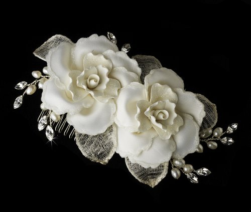 - Elegant ivory twin rose accent this beautiful bridal hair comb.