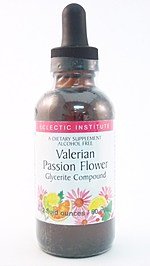 Valerian - Passion Flower No Alcohol Glycerite by Eclectic Institute 2 oz Liquid Valerian-Passion Flower 2 oz. Fresh wildcrafted Valerian ( Valeriana sitchensis ) root 1 1 40 Fresh certified organic Passion Flower ( Passiflora spp. ) leaf flower 1 1 15 Fresh certified organic Chamomile ( Matricaria chamomilla ) flower leaf 1 1 15 Dried Hops ( Humulus lupulus ) strobiles 1 4 15 Dried Anise ( Pimpinella anisum ) seed 1 4 15 . Kosher vegetable glycerine - 80 .