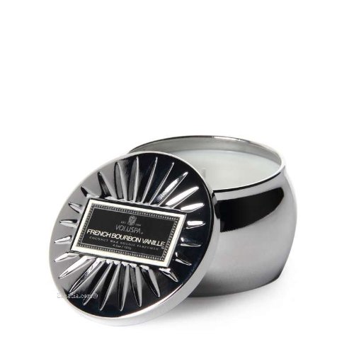 Voluspa Vermeil Travel Tin Candle - French Bourbon Vanille 4.5oz coconut wax blend. 100% cotton wick. Natural Coconut Wax Blend 25 hour burn time. Embossed metal powder tin. Fragrance: French bourbon vanilla beans ground and distilled for extract. A Voluspa Classic since 2006.