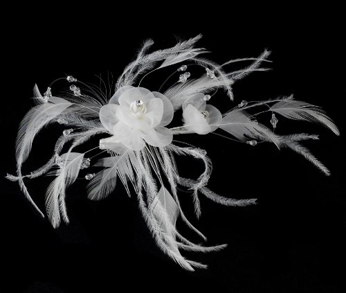 - This entrancing feather fascinator features two mesh fabric flowers at the center, subtle seed bead accents, and a surrounding spray of feathers.