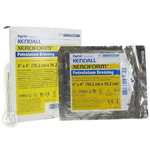 The Kendall Xeroform Petrolatum Gauze is a medicating, deodorizing, occlusive and non-adhering wound dressing composed of 3% Bismuth tribromophenate in a petrolatum blend on fine mesh gauze. Xeroform wound dressings help protect and promote moist wound healing and are indicated for use in compression therapy and in deep and shallow wounds. Each dressing is sealed in a sterile convenient peel-open, tamper-proof foil pouch. Xeroform #8884433500 measures 4" x 4". Box of 25 individually wrapped dressings.