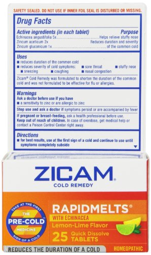 Zicam cold remedy rapid melts with echinacea lemon-lime flavor 25 count reduces duration and severity of the common cold.